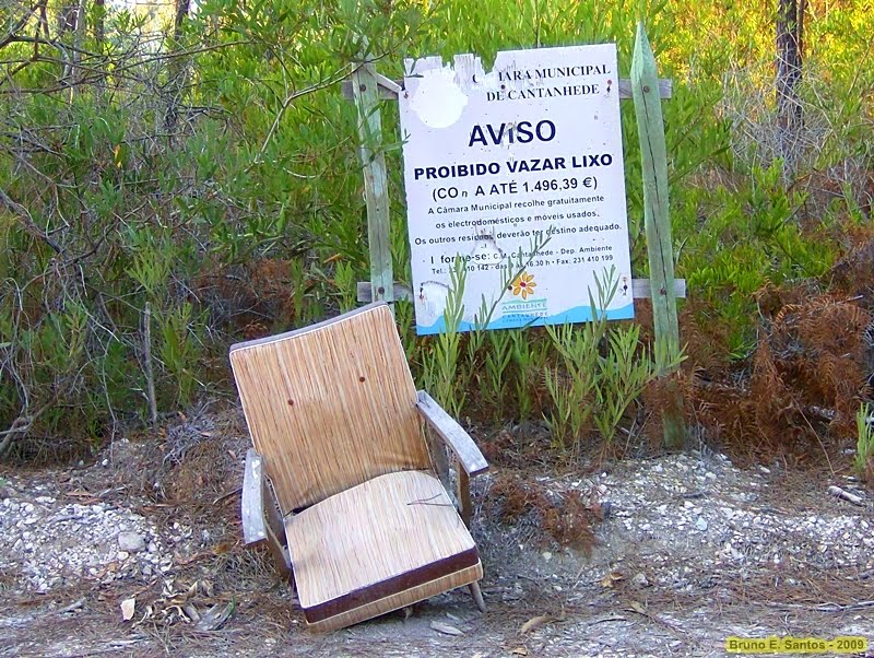 Na última semana de Setembro de 2009, fotografei este cadeirão abandonado, junto a uma tabuleta de aviso da Câmara Municipal de Cantanhede, a qual interditava a deposição de lixo. A fotografia foi tirada na berma do estradão de saibro que liga os Inácios à Lagoa dos Teixoeiros (Lagoa da Mata), junto ao cruzamento com o caminho com destino para as Berlengas, na Freguesia de Tocha (Concelho de Cantanhede). A tabuleta encontra-se visivelmente vandalizada e adulterada, tendo a palavra COIMA sido substituída por um conhecido palavrão do calão português. Conjunto de coincidências ou algum desconhecido a escarnecer das autoridades?